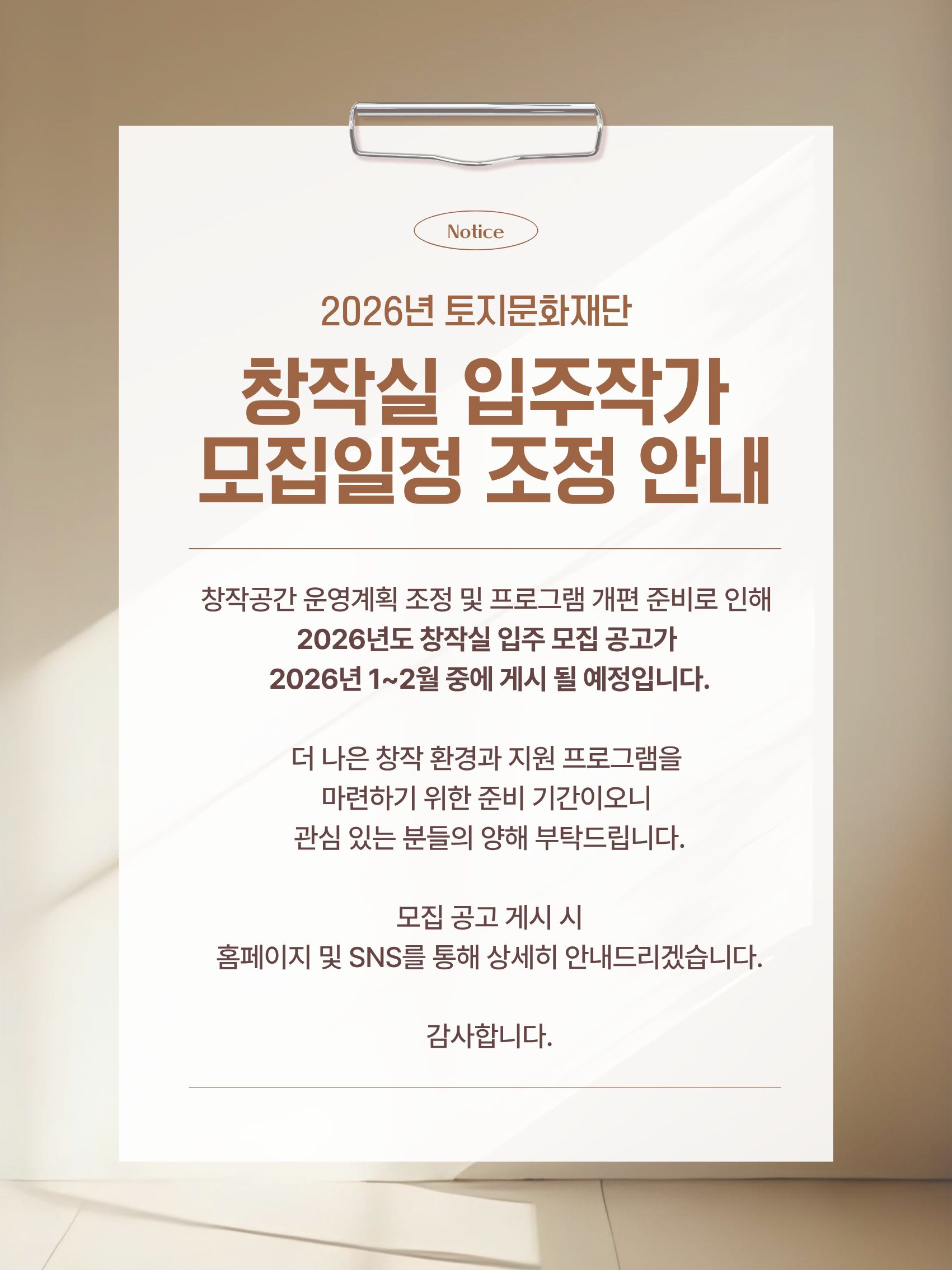 2025년 토지문화재단 문인 창작실 지원 사업에 관심을 가지고 신청해 주신 많은 문인분들께 깊이 감사드립니다. 기한 내 접수된 지원 신청서를 추천 위원이 심사하여 추천해주셨고, 이를 합산하여 추천 총점이 높은 순으로 선정하였습니다. 동일한 시기에 신청하신 분들이 많아 전부 지원해 드리지 못해 죄송합니다.선정되지 못하신 문인분께는 결원이 발생 할 경우 연락드리도록 하겠습니다. □ 토지문화재단 문인 창작실 추천 위원추천 위원은 창작실 입주 계획이 없는 원로 및 중견 문인·문학 관련 전문인으로 구성하였습니다. 추천 위원 분들의 요청으로 명단은 비공개합니다. □ 창작실 운영 기간 : 2025년 7월 1일 ~ 12월 31일 □ 창작실 입주일 : 매월 1일(1일이 공휴일, 주말인 경우 익일 입주) □ 창작실 지원 선정 명단□ 입주 안내 사항- 창작실 지원 선정자는 개별 통지하지 않으며 입주 예정일 1주 전에 문자로 연락을 드립니다.▪ 지원 기간에 입주가 어려울 경우 최소 한 달 전에 연락 주시기 바랍니다. - 창작실은 추첨으로 배정합니다.▪ 매월 1일(1일이 공휴일, 주말인 경우 익일) 오후 2시부터 당월 입주 작가가 오시는 순서대로 추첨을 통해 입주할 숙소를 정하며, 오후 3시에 본관 1층 대회의실에서 창작실 입주안내를 받습니다. 개인 사정으로 다른 시간에 입주하실 경우 미리 연락 주시기 바랍니다. - 창작실은 원룸 형태로 책상, 의자, 스탠드, 냉장고, 물병, 머그컵, 침대(침구 포함/베개 미포함)가 준비되어 있으며 욕실에는 휴지와 비누만 비치되어 있습니다. 창작 별관 1층 휴게실에는 공용으로 이용 가능한 세탁기, 정수기, 커피포트, 청소도구가 비치되어 있습니다. - 식사는 월요일부터 토요일 중식과 일요일 조식까지 제공되며, 토요일 석식과 일요일 중·석식, 법정공휴일 및 대체공휴일은 제공되지 않습니다. - 화재 위험으로 창작실과 휴게실에선 휴대용 부탄가스・전열기 등의 사용이 금지되어 있습니다. - 다중이용시설 금연법에 따라 창작실 및 토지문화관, 박경리 뮤지엄은 흡연 금지구역입니다. □ 문의처기타 문의사항은 토지문화재단(033-762-1382)으로 연락 주시기 바랍니다.
