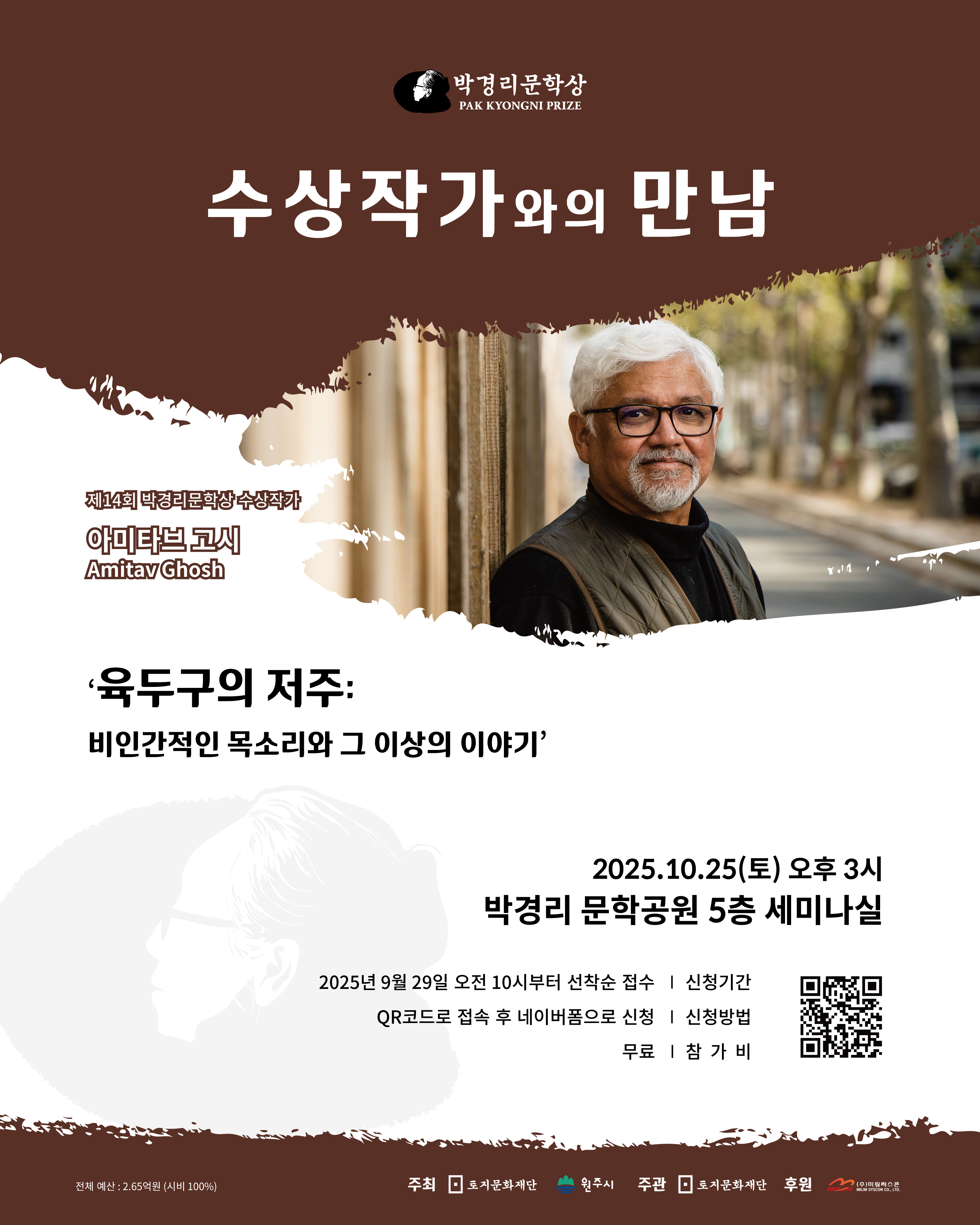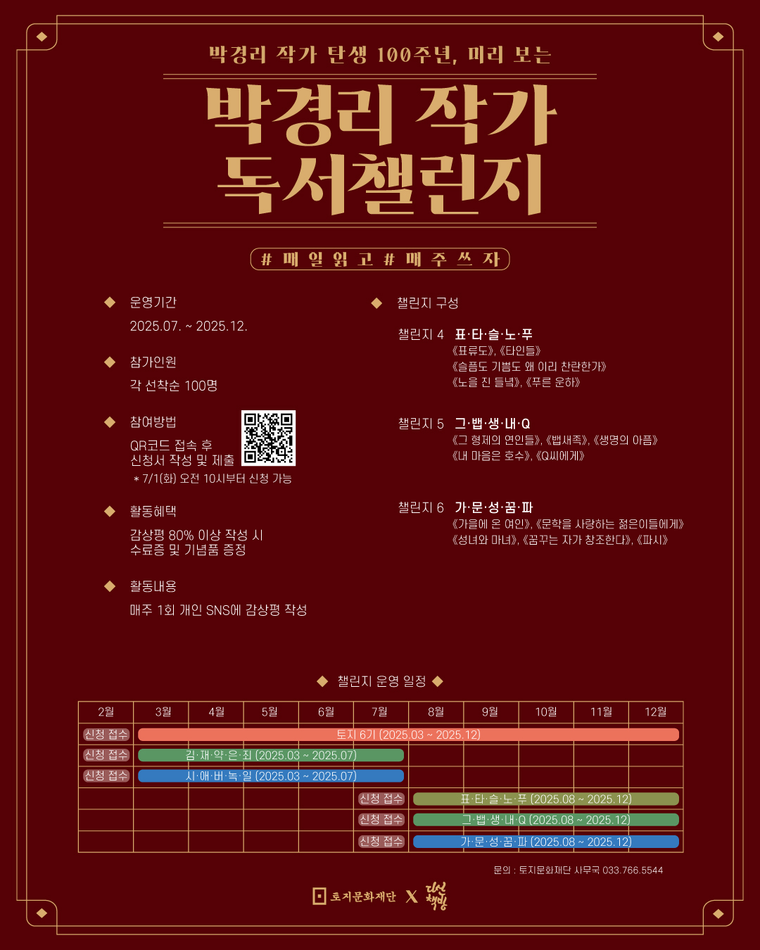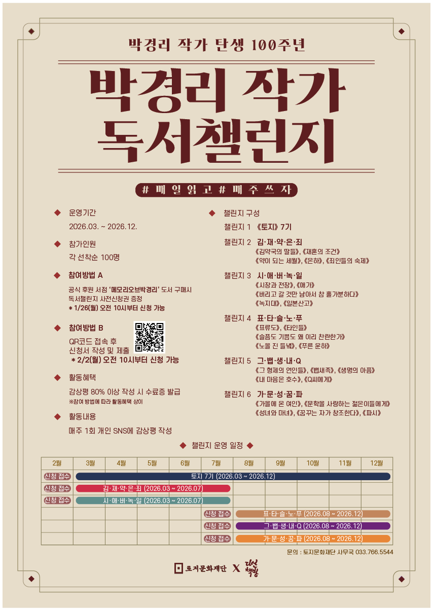 ■ 개요○ 주최/주관 : 토지문화재단○ 협력 : 다산북스○ 후원 : 메모리오브박경리 ■ 운영 정보○ 운영 기간 : 2026. 3. ~ 2026. 12. (챌린지 별 운영 기간은 상이합니다.)○ 내용- 매주 1회 개인 SNS에 감상평 작성<①~③> 중 선택 (④~⑥은 하반기 모집 예정입니다.)① 토지 7기② 김·재·약·은·죄 2기 《김약국의 딸들》, 《재혼의 조건》, 《약이 되는 세월》, 《은하》, 《죄인들의 숙제》③ 시·애·버·녹·일 2기 《시장과 전장》, 《애가》, 《버리고 갈 것만 남아서 참 홀가분하다》, 《녹지대》, 《일본산고》④ 표·타·슬·노·푸 2기 《표류도》, 《타인들》, 《슬픔도 기쁨도 왜 이리 찬란한가》, 《노을 진 들녘》, 《푸른 운하》⑤ 그·뱁·생·내·Q 2기 《그 형제의 연인들》, 《뱁새족》, 《생명의 아픔》, 《내 마음은 호수》, 《Q씨에게》⑥ 가·문·성·꿈·파 2기 《가을에 온 여인》, 《문학을 사랑하는 젊은이들에게》, 《성녀와 마녀》, 《꿈꾸는 자가 창조한다》, 《파시》 ■ 토지 7기 / 김·재·약·은·죄 2기 / 시·애·버·녹·일 2기 모집 사항○ 모집 인원 : 선착순 100인○ 신청 방법 A : 공식 후원 서점 '메모리 오브 박경리' 도서 구매시 독서챌린지 사전신청권 증정(https://smartstore.naver.com/memoryofpkn ) 모집기간: 2026.01.26.09:00 ~ 2026.2.18.24:00○ 신청 방법 B : QR코드의 신청서 작성 후 제출(https://docs.google.com/forms/d/1uZLQT_uSkPUGQBJV8s7LhFCw5nCES7cJw5jmufTMa6s) 모집 기간: 2026.2.2.10:00 ~ 2026.2.28. 24:00 ■ 활동 내용○ 감상평 80% 이상 작성 시 수료증 발급 ※ 참여 방법에 따라 활동혜택 상이○ 매주 1회 개인 SNS에 감상평 작성“지속 가능한 독서챌린지를 위한 독자들의 따뜻한 동행”《박경리 작가 독서챌린지》는 누구나 자유롭게 참여할 수 있는 독서 프로그램으로 운영되어 왔습니다.다만, 매 회차마다 발생하는 기념품 제작 및 우편 발송 등 운영비 부담이 지속됨이 따라 챌린지를 장기적으로 운영하기 위해 2026년 독서챌린지부터 참여 방식을 일부 조정하여 운영하고자 합니다.이에 공식 후원 서점 메모리오브박경리와 협력하여 도서 구매를 통한 ‘착한 소비 후원형 참여’ 방식을 새롭게 마련하였습니다. 해당 서점에서 구매한 도서의 판매 수익금은 독서챌린지 수료자에게 제공되는 기념품 등 독자에게 직접 제공되는 항목에 후원됩니다.소장용 도서 구매를 계획 중이시라면, 챌린지를 응원하는 마음으로 함께해 주세요!◆ 옵션 A. 착한 소비 후원형 신청 (공식 후원 서점 ‘메모리오브박경리’에서 도서 구매) - 도서를 구입하여 챌린지를 시작하고 싶은 분들을 위한 참여 방식입니다. - 구매 혜택 : 책갈피 증정, 독서챌린지 사전 신청권 증정 - 참여 혜택 : 완독을 위한 1일 독서 분량 안내(1일 출석체크 진행), 작품 이해를 위한 독서 참고자료 및 강연 영상 자료 제공, 참가자 독서감상평 공유 자료 제공 - 특전 : 완독 기념 수료증 발급(우편 발송 예정), 챌린지 기념품 증정 ※ 도서 수익금은 본 독서챌린지 참여자에게 직접 제공되는 항목에 후원됩니다.◆ 옵션 B. 자유 참여형 신청 (도서관 대여 및 소장 도서) - 도서관 대여나 기존 소장 도서로 선착순 챌린지 참여가 가능합니다. - 참여 혜택 : 완독을 위한 1일 독서 분량 안내(1일 출석체크 진행), 작품 이해를 위한 독서 참고자료 및 강연 영상 자료 제공, 참가자 독서감상평 공유 자료 제공 - 특전 : 완독 기념 디지털 수료증 발급(이메일로 발송 예정) ※ 도서 구매 및 발송 안내 - 구매 기간 : 2026년 1월 26일(월) ~ 2월 18일 (수) - 구매처 : 스마트스토어 메모리오브박경리 (클릭시 링크 연결) - 독서챌린지 사전 신청권 증정을 위해 주문서 작성시 [박경리 작가 독서챌린지 신청] 문구를 기재해 주세요. 확인 후 담당자가 네이버 톡톡을 통해 개별 안내를 드릴 예정입니다. - 발송 일정 : 2026년 2월 24일(월) ~ 2월 28일 (금) (*기간 내 순차적으로 일괄 발송 예정입니다.)■ 문의 : 토지문화재단 033-766-5544 / tojicul@naver.com