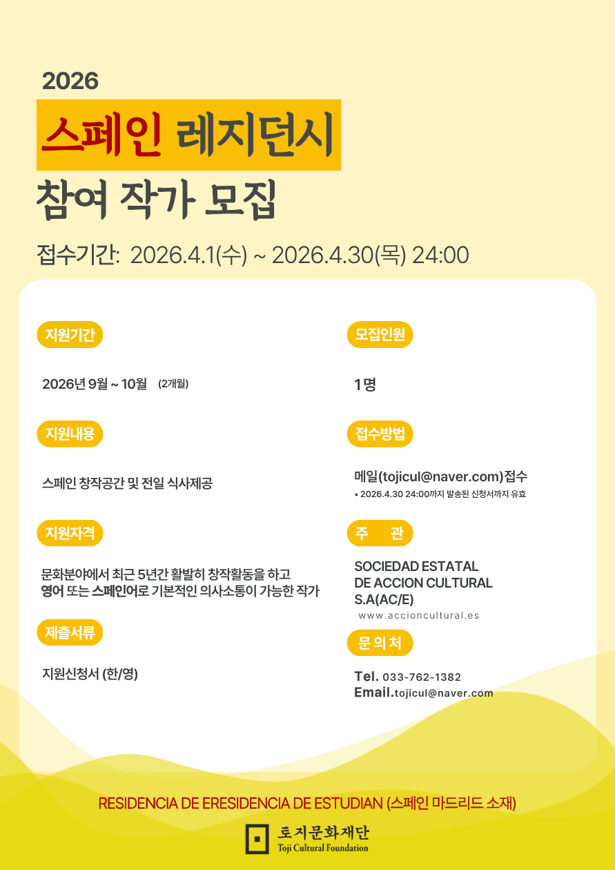 □ 사업 목적토지문화재단은 스페인 문화활동국립협회 SOCIEDAD ESTATAL DE ACCIÓN CULTURAL, S. A.와의 양국 간 한국‧스페인 작가 교류 해외 레지던스 지원 프로그램 협약을 통해 우리 작가의 역량을 강화하고 국제 교류에 기여하고자 한다.□ 취지토지문화재단의 해외작가 레지던스 프로그램의 우수성을 경험한 해외작가들이 자국의 문학 지원 단체에 정식 교류를 촉구하여 싱가포르·미국 등과 협약을 맺었으며, 스페인 예술가 후원 기관인 AC/E에서 대한민국 작가의 스페인 교류를 제안하여, AC/E와 2016년 협약을 맺고 현재까지 지속적으로 작가 교류 해외 레지던스 프로그램을 운영하고 있다.〇 2016년 대한민국 천운영(소설가), 스페인 Nuria Barrios Fernandez(시인, 소설가)〇 2017년 대한민국 이성아(소설가), 스페인 Fernando Epelde Garcia(극작가)〇 2018년 대한민국 김이정(소설가), 스페인 Antonio Jose Rojano(극작가)〇 2019년 대한민국 김호연(소설가, 시나리오 작가), 스페인 Alberto Torres Blandina(소설가)〇 2022년 대한민국 최민석(소설가), 스페인 Hector Castells(문학소설, 논픽션)〇 2023년 대한민국 이경혜(동화/청소년소설가), 스페인 Ana Barceló(극작가, 연극 연출가)〇 2024년 대한민국 정여랑(소설가), 스페인 Alex Reyes(소설가)〇 2025년 대한민국 김현례(그림책, 아동문학 작가), 스페인 María Begoña Moreno Rueda(시인)□ 신청 자격문학(시, 소설, 평론, 희곡, 동화) 및 예술(드라마 대본, 영화 시나리오) 분야에서 최근 5년 동안 창작 활동을 활발히 하고 있으며, 영어 또는 스페인어로 기본적인 의사소통이 가능한 작가▪ 지원 인원: 1인▪ 지원 기간: 2026년 9월~10월▪ 지원 내용: 창작 공간 및 전일 식사 제공(항공권 및 여행자보험 제외) Residencia de Estudiantes가 제공하는 부대시설(숙소 포함)에 Wi-Fi, 숙박지에서의 모든 활동, 도서관과 전시회, 컴퓨터실 무료□ 레지던스 공간: Residencia de Estudiantes(스페인 마드리드 소재)▪ 레지던스 주관: SOCIEDAD ESTATAL DE ACCIÓN CULTURAL, S.A.(AC/E) www.accioncultural.es▪ 주소: Pinar, 21-23. 28006 Madrid, Spain▪ 공간 홈페이지: www.residencia.csic.es▪ 소개: 스페인 마드리드에서 가장 활발한 문화 센터로, 1910년에 설립되어 작가와 예술인, 과학자들에게 창작 공간과 다양한 프로그램을 지원을 통하여 스페인 문화예술의 중심지가 되었고, 유럽 예술 및 과학의 교류 장소로 사용되었다. 살바도르 달리, 페데리코 가르시아 로르카, 루이스 부뉴엘, 마리 퀴리, 알버트 아인슈타인 등의 예술인과 과학자들이 머물렀던 유서 깊은 장소이다. 연간 전 세계의 3,000여 명의 학자, 예술가, 문인들이 레지던스에 참여해 머물고 있으며, 콘서트, 컨퍼런스 및 전시회 등을 개최하고 있다.□ 지원서 접수기간: 2026년 4월 1일부터 4월 30일 24:00까지□ 신청 방법재단 홈페이지 주요행사에서 해당 지원서를 내려받아 작성 후 이메일 tojicul@naver.com 접수▪ 지원신청서: 본인 작품 활동 경력, 이용목적, 작업계획을 한글 및 영문 신청서 각기 작성. ※신청서 양식 다운 받는 곳: https://tojicf.com/sub/sub04_02.php?boardid=event&mode=view&idx=82&sk=&sw=&offset=&category=▪ 제출 자료: 기타 심의에 도움이 된다고 판단되는 자료(해당 사항이 있을 경우) - 필요한 자료는 이메일 제출을 원칙으로 하되, 팸플릿·책자 등 파일 첨부가 불가능한 경우에 한하여 우편으로 제출해주십시오.(제출된 자료는 일체 반환하지 않습니다.) - 해외에서 발표 혹은 출간된 작품, 인터뷰 등이 있다면 링크를 첨부해주십시오. - 제출 자료는 영문 혹은 스페인어로 작성해 첨부해주시길 바랍니다.▪ 선정자 발표: 7월 중 발표 예정□ 선발 방법스페인 문화활동국립협회(AC/E)에서 최종 1명을 선발□ 문의처: 토지문화재단 사무국 해외 레지던스 담당▪ 연락처: 전화 033-762-1382 / 팩스 033-766-5545▪ 홈페이지: tojicf.com▪ 이메일: tojicul@naver.com▪ 주소: (26494) 강원특별자치도 원주시 흥업면 매지회촌길 79